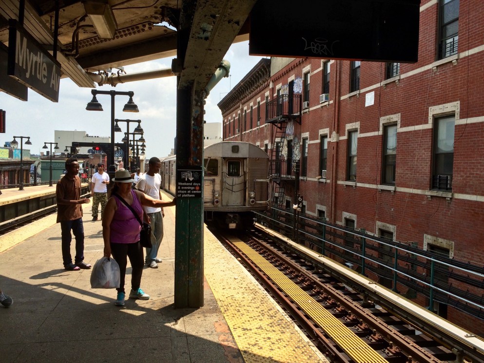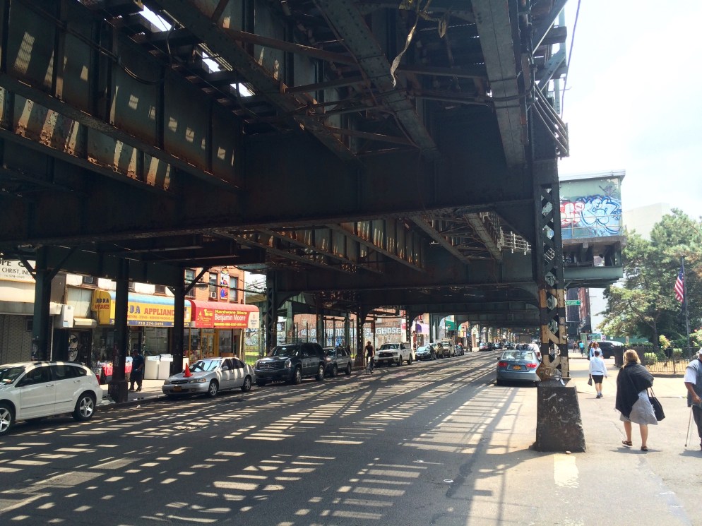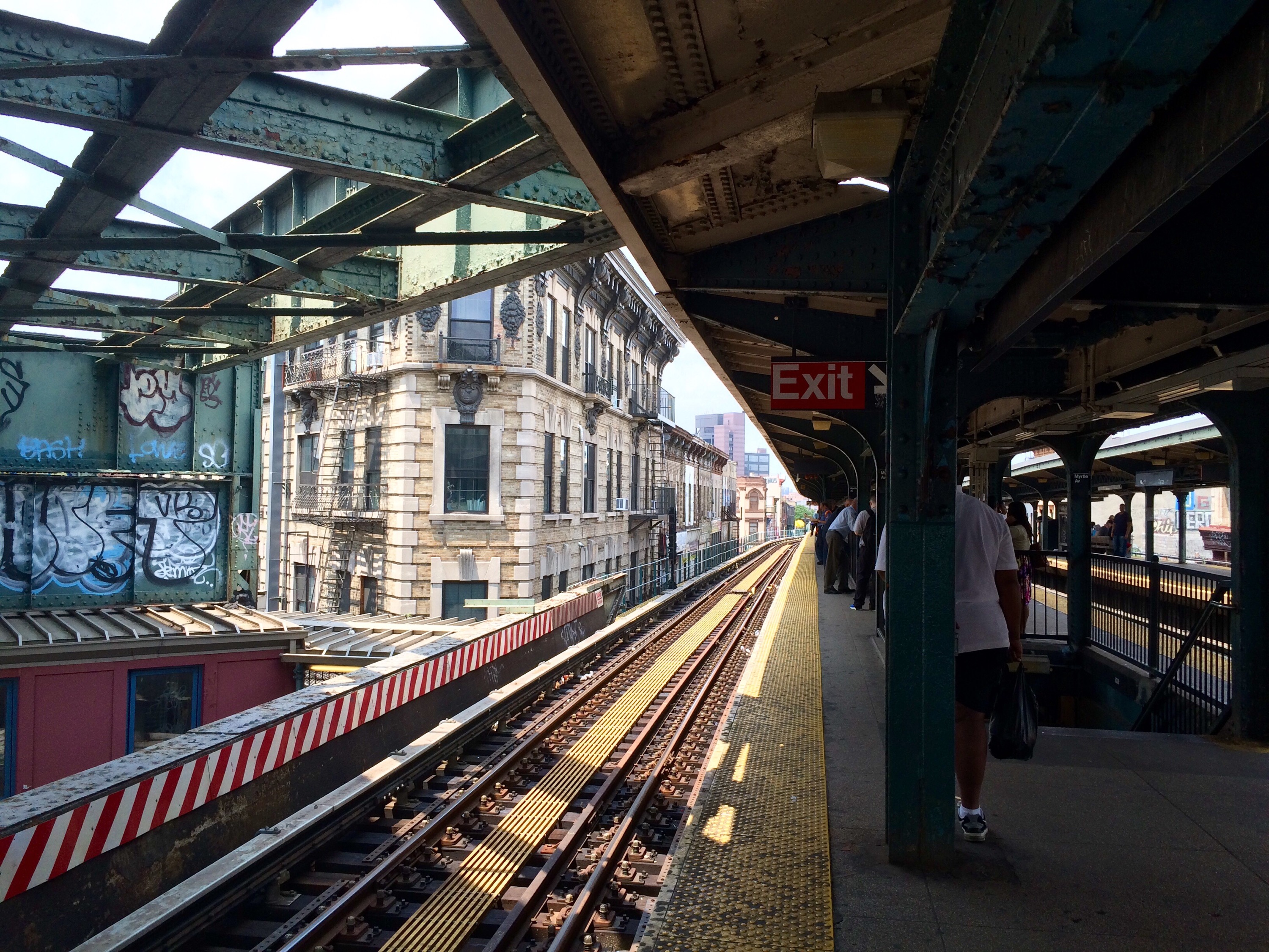 Wir alle kennen die New Yorker Metro von Bildern oder aus Filmen … sie fährt manchmal unterirdisch, aber manchmal eben auch überirdisch auf Stelzen. Das wollten wir gerne noch erleben. So fuhren wir mit der Linie M bis zur Stadtteilgrenze Queens … und stiegen dann um in die L. Das Gleisbett sah wenig vertrauenserweckend aus. Alle Gleisschwellen hatten unterschiedliche Längen … und die Bahn fuhr ganz langsam an diesen Stellen …
