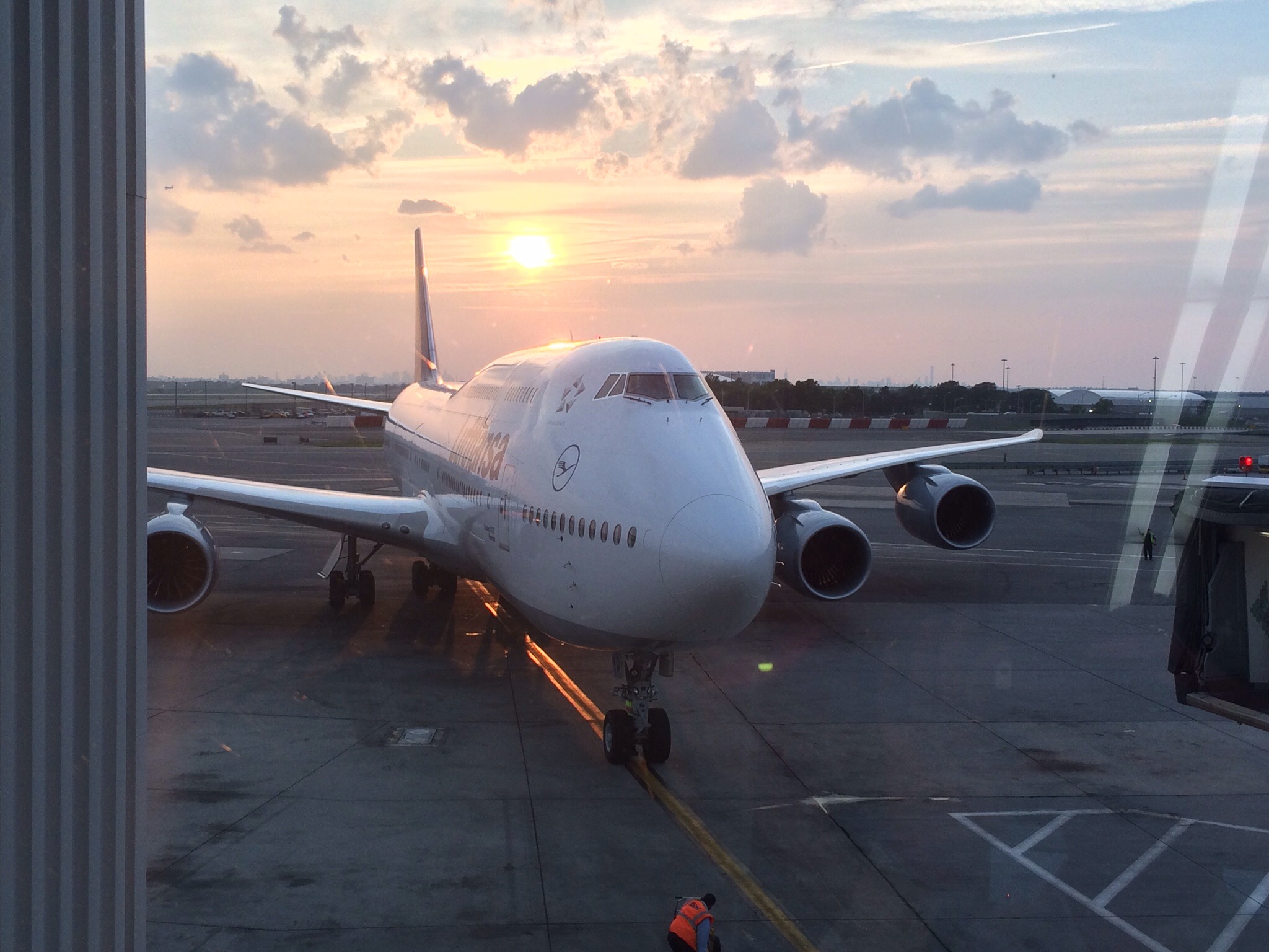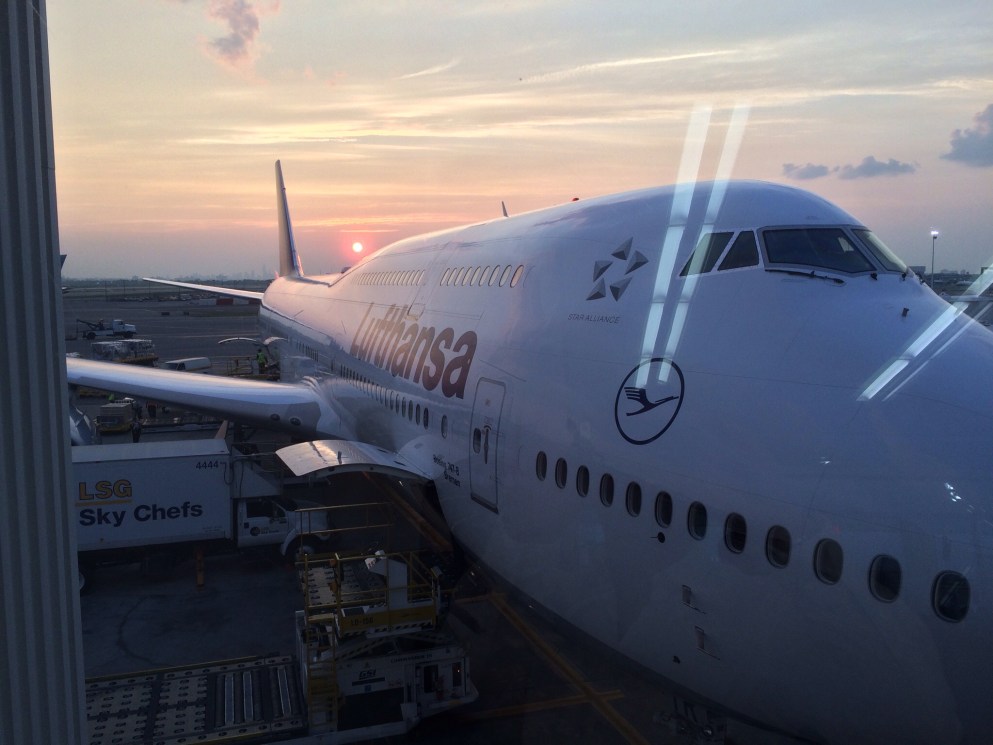 Am Gate 7A angekommen, war unsere Maschine noch gar nicht da … kam aber kurz darauf aus Frankfurt an … und stand dann majestätisch im Sonnenuntergang … im Hintergrund kann man schemenhaft die Skyline von NYC erkennen …
