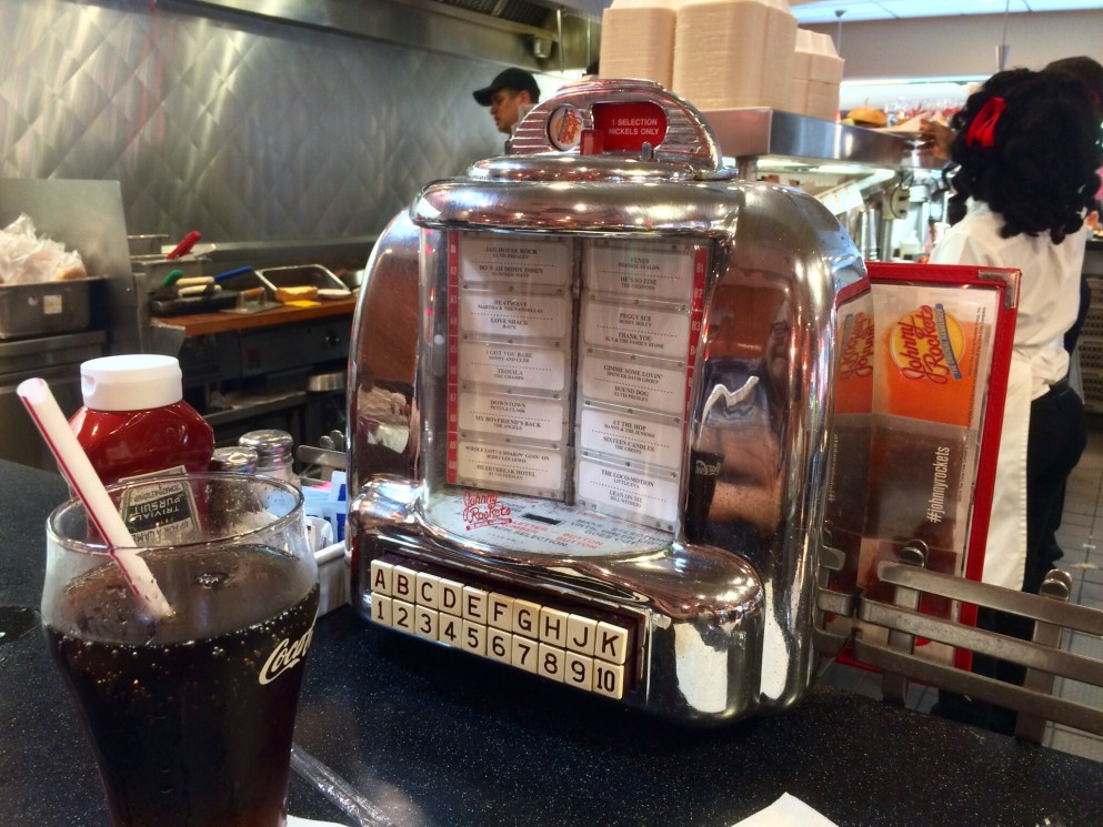 Zum Mittagessen gab es die für uns ersten Burger in NYC im „Johnny Rockets“, einem Diner im Stil der 50er Jahre. Auf der Theke standen kleine, voll funktionstüchtige Musicboxen … total süß 😉